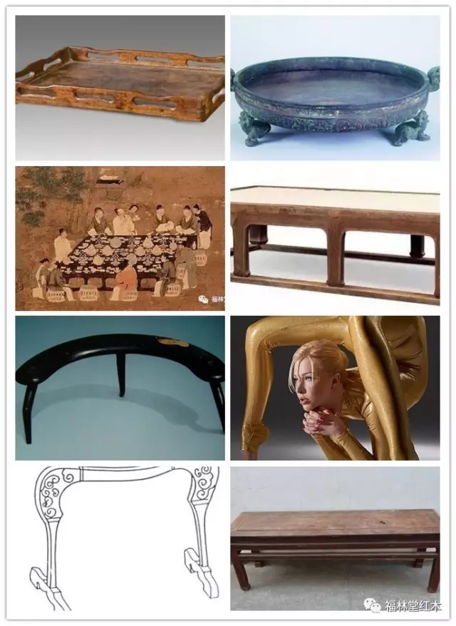早期的榻比較巨大,有史圖可靠的在唐太宗時期的十八學士圖可見一番。當時的榻可以當做今天的桌案來看,有兼有坐臥之功能,所以不是專業的承具;早期的憑幾是用來依靠的,后來憑幾面越來越大,可以放置文稿、筆墨等,也可以視為承具的早期替代形制等等。我們福林堂紅木認為,今天稱之為“托盤”的是最早期專業承具的代表。下圖我們整理了一些圖片,大家一起辨認一下。關于托盤還有一個表示夫妻相敬如賓的魅力傳說“舉案齊眉”的故事。